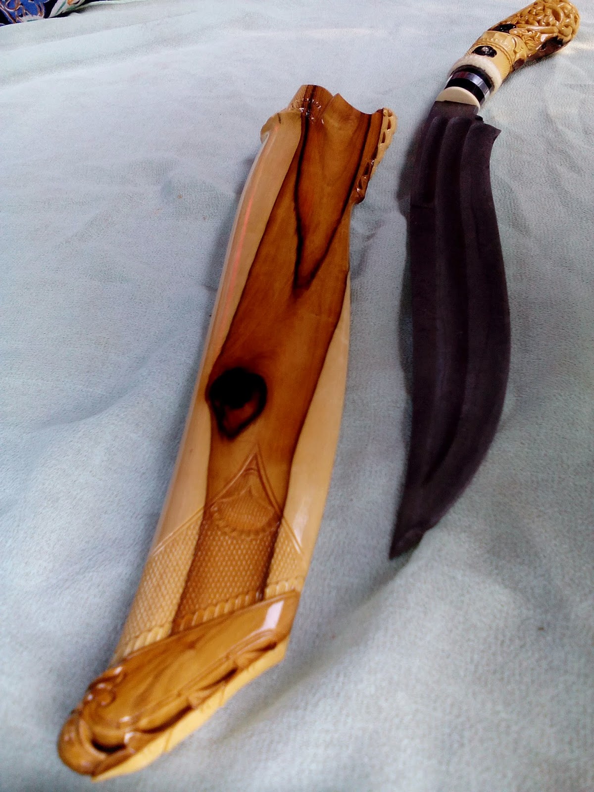Barang baru,matanya di buat lurah melela mengunakan besi baja seputung,menpunyai pamor miang,hulu dan sarungnya daripada kemuning..bahagian hulunya agak unik kerana mengunakan kayu yang buruk semulajadi di bahagian sebelah kanan,teminnya di gabungkan banyak bahan seperti tanduk,gading dan tanduk rusa..